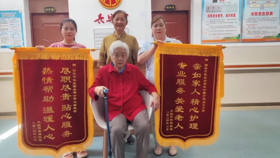 一面暖心锦旗、承载着一段故事、凝聚着一份真情(早上老人吃饭时护理人员及时发现了老人的异常并及时汇报养老负责人,养老负责人及时联系了医院急诊主任并及时进行了手术)长乐宫老年公寓的护理人员用她们的实际行动书写着一曲曲悠扬动人的敬老爱老之歌。